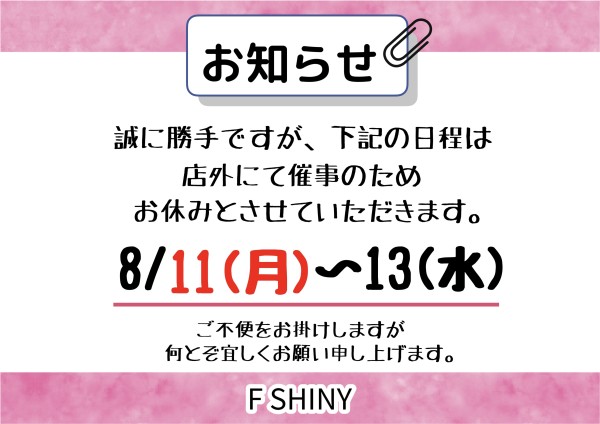 まことに勝手ではございますが、下記の通りお休みとさせていただいております。お問い合わせなどございましたら、お休み明けに随時ご対応させていただきます。ご了承くださいませ。 どうぞ宜しくお願い申し上げます。