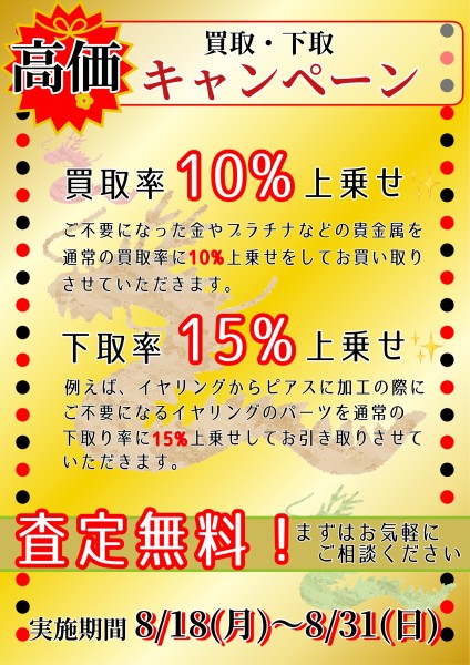 日々の地金の高騰により、お買取りの査定やお問い合わせが多くイベント好評につきまして買取下取りキャンペーン期間の